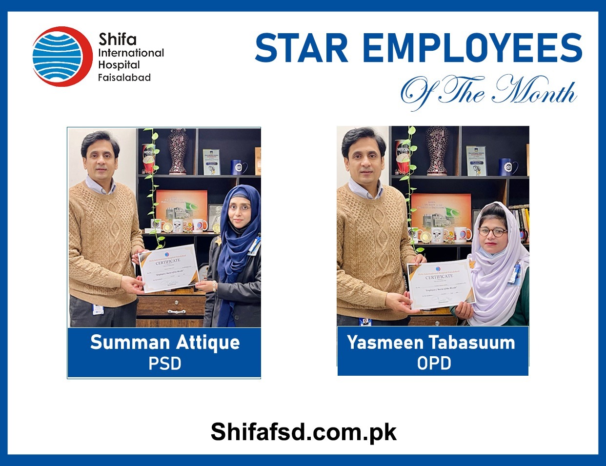 Shifa International Hospital, Faisalabad is thrilled to announce our Star Employees of the Month. This recognition is a testament to their exceptional work ethic, dedication and positive attitude. These employees consistently go above and beyond in their roles, making them true assets to our team. Their hard work does not go unnoticed.Please join us in congratulating them on their well-deserved achievements. Thank you for their continued dedication and commitment towards service excellence.